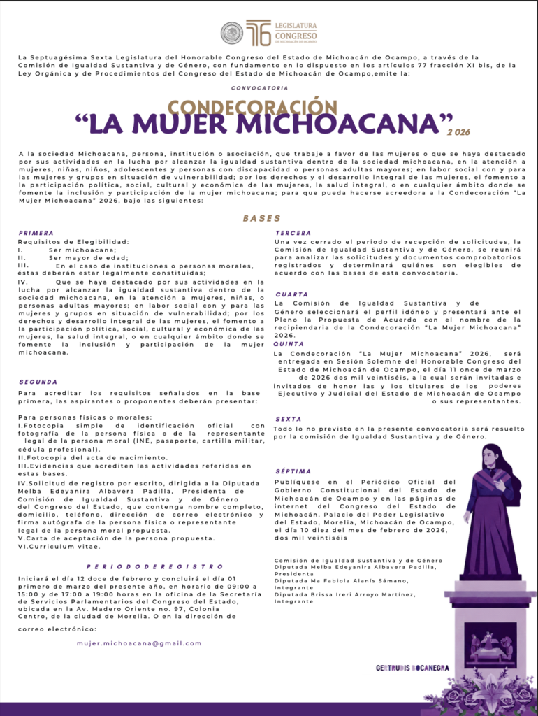 La convocatoria oficial ya se encuentra en las redes sociales oficiales del Congreso del Estado y en el sitio web de este Poder Legislativo en el siguiente link: https://congresomich.site/wp-content/uploads/2026/02/MUJER-MICHOACANA2026_20260212_162010_0000.pdf.pdf