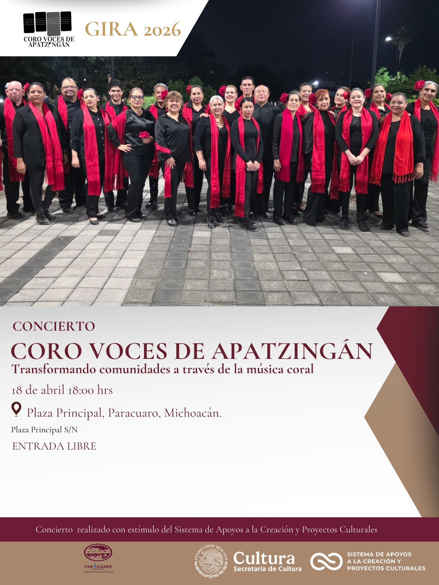 PARÁCUARO, MICHOACÁN – El corazón de la «Villa de los Manantiales» se prepara para una velada de gala. El H. Ayuntamiento de Parácuaro, encabezado por el C. Josafat Bautista González, en una labor conjunta con la Regiduría de Cultura dirigida por la C. Sarahí Villanueva Miranda, ha anunciado la presentación del reconocido Coro “Voces de Apatzingán”.